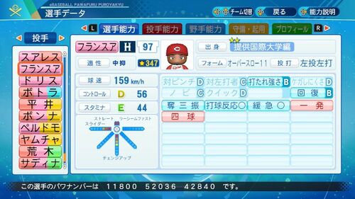 抑えに定着し孤軍奮闘 ヘロニモ・フランスア(Geronimo Franzua、1993年9月25日 - ) 再現年度…2020年(2勝3敗19S7H 防御率2.45) 査定 何かこうなってました。 一言 スアレス(神)の査定で苦労してる。