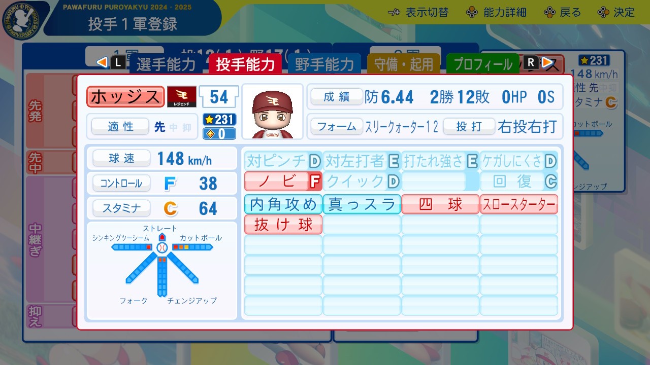 2025-03-10 ケビン・ホッジス(楽天)【パワプロ2024】 実在 楽天 かつての最多勝投手が新球団へ パワナンバー[] 再現年度…2005年(2勝12敗 防御率6.44) 査定 変化量を1だけ上げました。1年目楽天で打たせて取るピッチャーは厳しかろうというか。 前のだと今の楽天に入れて防御率やWHIPが現実と同等か下手したらそれ以下になってしまいかねなかったので、それは弱くなりすぎかなと… カットボールの数字は3にしてもいいかなくらいはある。 一言 ここ最近のプレイ時間はサッカーゲーム(FC25)がとても多くなってしまっています。 作成選手一覧はこちら。